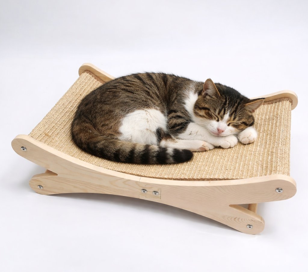 This new cat bed features a sturdy natural wood frame combined with a durable woven sisal surface. The curved ergonomic design gently supports a cat’s body, creating a cozy lounging area that encourages relaxation. At the same time, the natural sisal material allows cats to scratch and stretch, helping maintain healthy claws and reducing damage to household furniture.